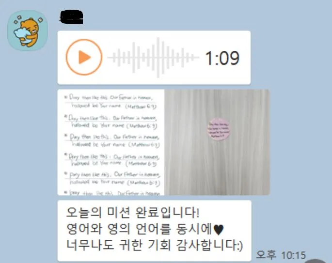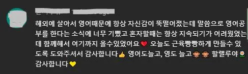 유튜브 댓글: 해외에 살아서 영어때문에 항상 자신감이 뚝떨어졌는데 말씀으로 영어공부를 한다는 소식에 너무 기뻤고 혼자할 때는 항상 지속되기가 어려웠었는데 함께해서 여기까지 올수있었어요! 오늘도 근육빵빵하게 만들수 있도록 도와주셔서 감사합니다. 영어도 늘고, 영도 늘고 할렐루야!